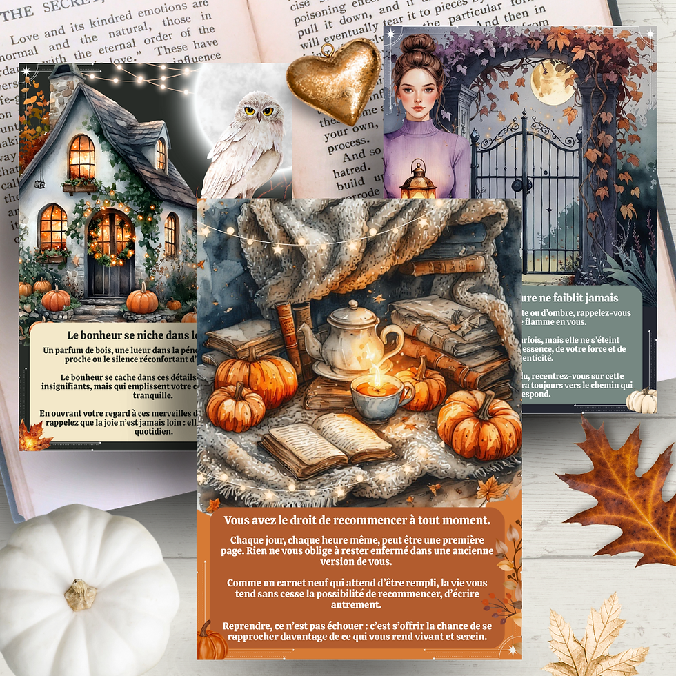 Et si vous avez envie d’un support doux pour traverser ces cycles, mes Oracles Les Petits Bonheurs ont été imaginés comme des compagnons : des cartes réconfortantes, poétiques, qui vous aident à prendre du recul, à trouver des pistes de réflexion, et à remettre un peu de douceur dans le quotidien… saison après saison.